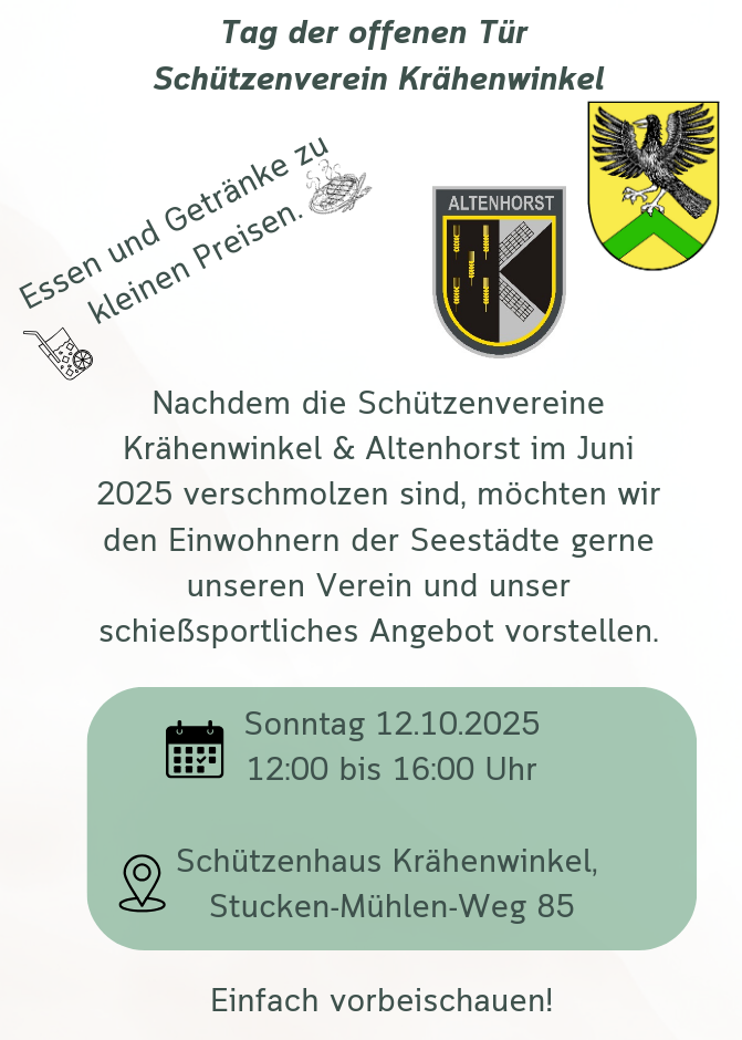 Wir laden alle Einwohner der "Seestädte" Hainhaus, Maspe, Twenge und Altenhorst ins Schützenhaus am Stucken-Mühlen-Weg 85 ein, um nach der Verschmelzung der Schützenvereine Altenhorst und Krähenwinkel das Angebot des Schützenvereins und das Schützenhaus kennenzulernen. Es wird gegrillt, es gibt Kuchen und Getränke zu kleinen Preisen.